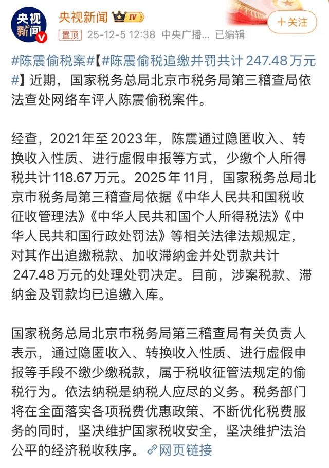 車圈知名自媒體人陳震因偷稅漏稅被全平臺封禁,相關處罰決定引發廣泛關注。據稅務部門通報,2021至2023年間,陳震通過隱匿收入、虛假申報等手段少繳個人所得稅118.67萬元,最終被追繳稅款、滯納金并處罰款共計247.48萬元。目前涉案款項已全部入庫,其名下企業也被曝存在欠稅記錄。