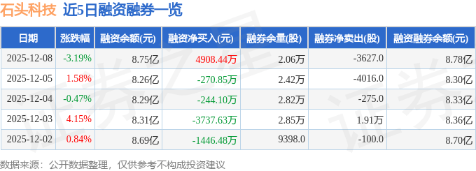 在融資融券方面,石頭科技當日融資買入額為8891.28萬元,融資償還額為3982.84萬元,融資凈買入額達到4908.44萬元。融券交易方面,公司融券賣出2072.0股,融券償還5699.0股,融券余量維持在2.06萬股,融券余額為323.49萬元。截至當日,公司融資融券余額總計為8.78億元。