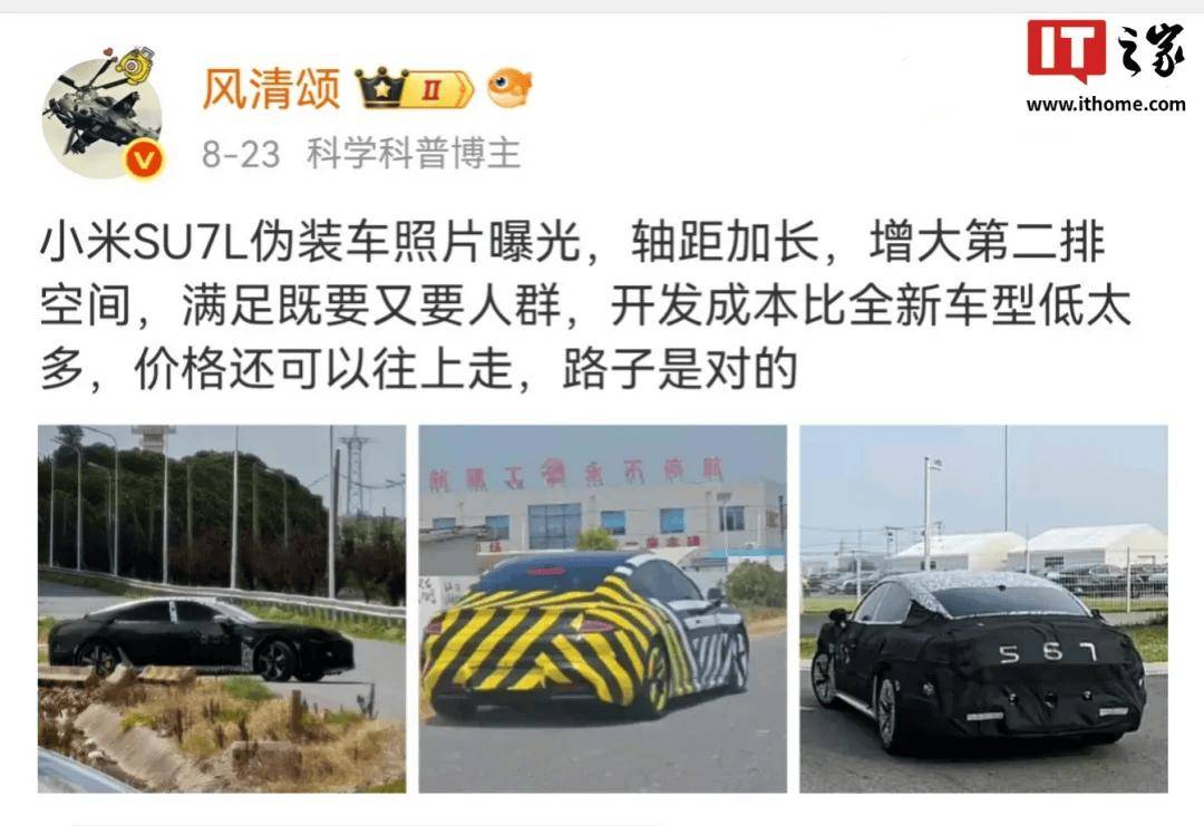 再看小米SU7的衍生車型,暫且稱其為“SU7L”。11月中旬,有微博博主暗示“小米SU7改款車型在路上”,同時SU7 Pro/Max的交付時間大幅縮短。考慮到SU7于2024年3月28日上市,即將年滿兩年,確實到了改款節點。除了常規改款,其衍生車型也在測試中。8月23日,博主@風清頌曬出一組正在路試的神秘偽裝車照片,直言是“SU7L”。從圖片看,該車線條與小米SU7相近,但B柱之后部分明顯更長,車身拉長后整體造型更修長,增添了行政豪華氣息。車身和軸距加長后,車長可能達5.1米級別,軸距有望逼近3.1米,后排空間表現將提升,尾部大溜背設計得以保留,能滿足既注重顏值又追求空間的消費者需求。以SU7為基礎開發加長版車型,不少網友認為這是妙招,既比開發全新車型成本低,價格還能上探。看重性能的用戶可選擇SU7,傾向行政的用戶則有了SU7L這一新選擇。