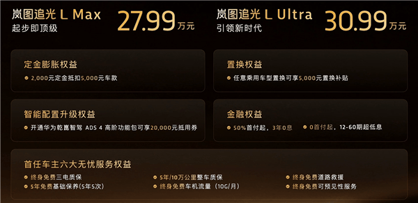 嵐圖品牌旗下全新旗艦轎車追光L正式登陸市場,此次推出Max與Ultra兩個版本,官方指導價區間為27.99萬至30.99萬元。購車用戶可享受多項專屬權益,具體細則可通過官方渠道查詢。