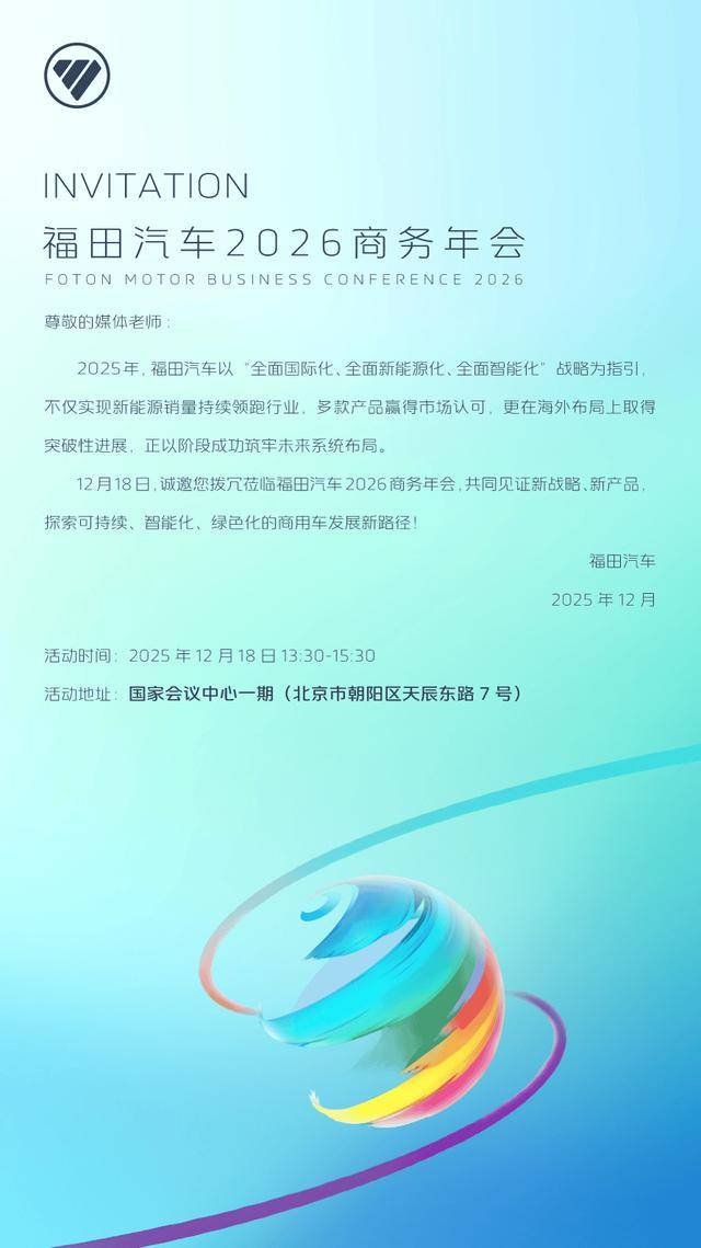 12月18日,福田汽車2026商務年會將在北京國家會議中心啟幕。這場行業盛會將集中展示“三個全面”戰略轉型成果,并發布多款重磅新品:卡文重卡以專屬新能源平臺開啟零碳長途運輸新紀元;智能巴士通過自動駕駛技術重新定義短途出行;歐曼銀河混動重卡以雙擎協同樹立能效新標準。基于全球首個純電輕卡專屬平臺打造的啟明星系列產品將公布官方定價,進一步豐富新能源產品矩陣。活動現場,數千名媒體、合作伙伴及經銷商代表將共同見證這一行業盛事,福田汽車官方視頻號、抖音號也將全程直播。