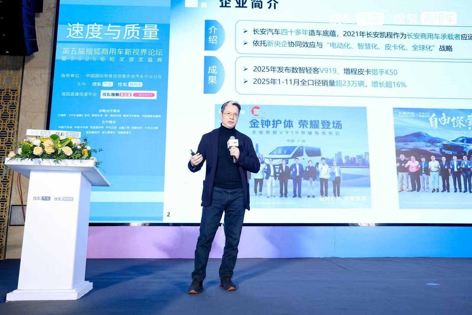 在主題為“速度與質(zhì)量”的第五屆搜狐商用車新視界論壇暨2025鉅輪獎頒獎盛典上,長安凱程總裁董晨睿發(fā)表了關(guān)于企業(yè)戰(zhàn)略與行業(yè)趨勢的深度演講。他指出,新能源技術(shù)與智慧化轉(zhuǎn)型是商用車行業(yè)突破發(fā)展瓶頸的核心路徑,而皮卡與全球化布局將成為企業(yè)實(shí)現(xiàn)“世界一流品牌”目標(biāo)的關(guān)鍵支撐。