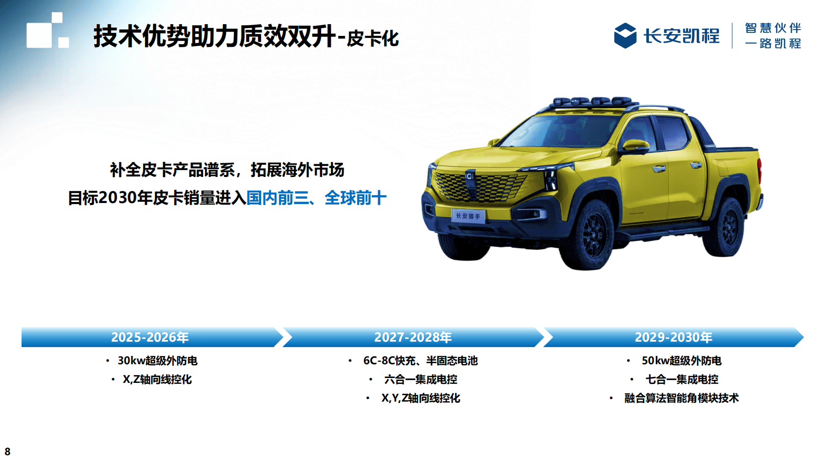 皮卡戰(zhàn)略是長安凱程全球化布局的重要支點(diǎn)。董晨睿分析,國內(nèi)皮卡年銷量不足30萬輛,但全球市場占比達(dá)45%。為抓住這一機(jī)遇,企業(yè)計(jì)劃補(bǔ)齊皮卡產(chǎn)品譜系并推出SUV版本,同時重點(diǎn)開拓海外核心市場。2030年目標(biāo)包括:皮卡年銷量超20萬輛(國內(nèi)前三、全球前十),海外銷量占比超40%(有望達(dá)50%)。全球化運(yùn)營方面,長安凱程已構(gòu)建五大海外事業(yè)部,覆蓋歐亞、歐洲、中東非、東南亞及中南美市場,未來將新增10個海外KD中心,團(tuán)隊(duì)規(guī)模擴(kuò)充至1000人以上,目標(biāo)在12個市場實(shí)現(xiàn)萬臺級銷量。