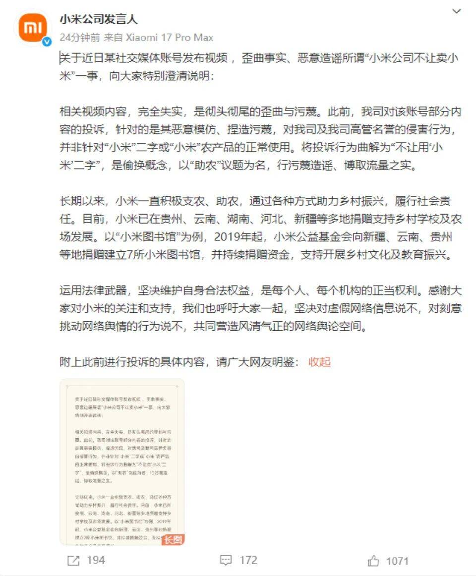 當日下午4點51分,“小米公司發言人”通過微博發布聲明,稱相關視頻內容嚴重失實,是對公司的惡意歪曲與污蔑。此前公司針對某賬號的投訴,主要針對其惡意模仿、捏造污蔑行為,侵害了公司及高管的合法權益,而非限制“小米”二字或相關農產品的正常使用。將投訴行為曲解為“禁用‘小米’”,是偷換概念,借“助農”之名博取流量、造謠污蔑。聲明中還附上了此前投訴馮某寬的具體內容。