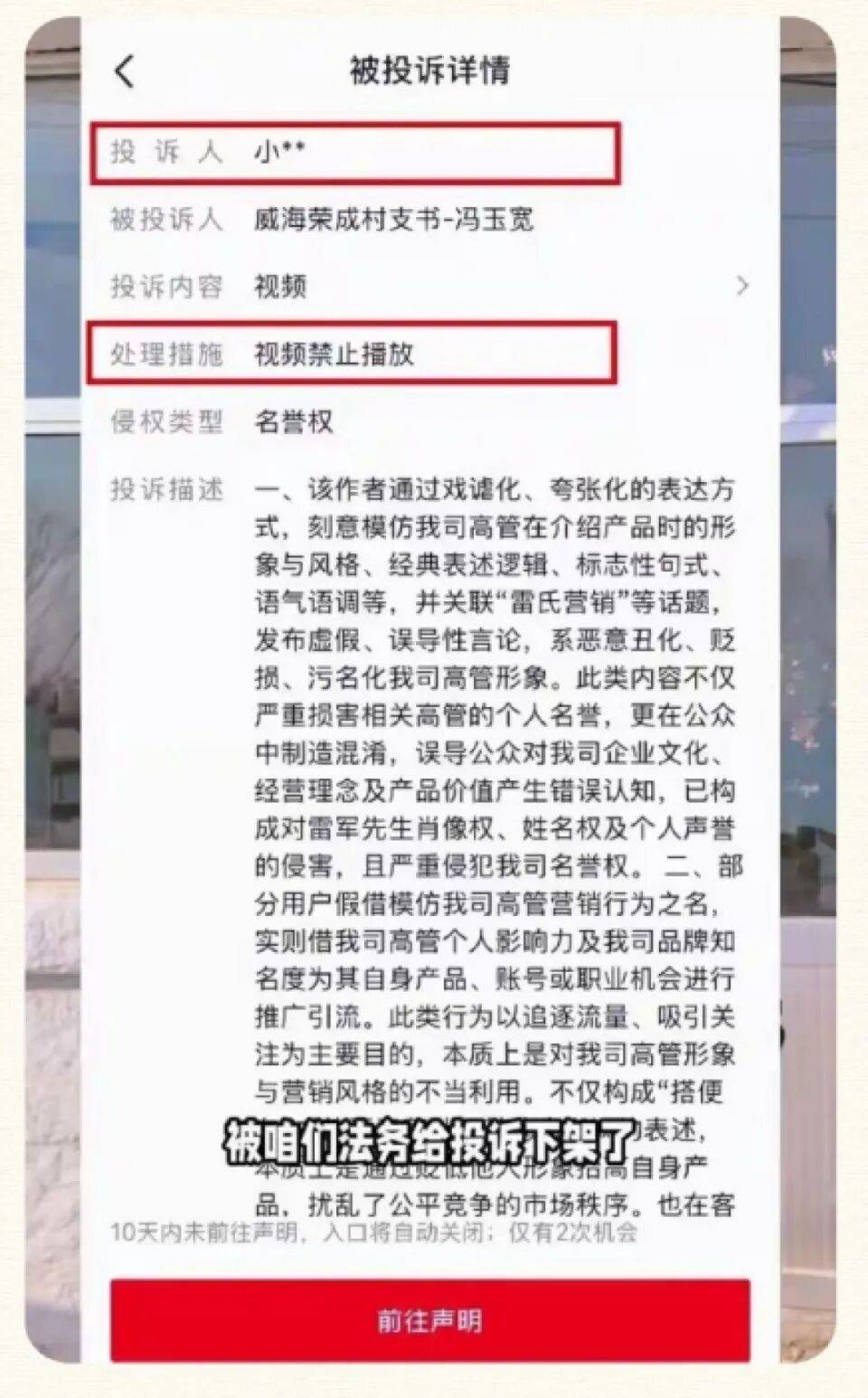 根據小米公司提供的投訴描述,該賬號通過戲謔、夸張的表達方式,刻意模仿公司高管介紹產品時的形象、風格、表述邏輯、標志性句式及語氣語調,并關聯“雷氏營銷”等話題,發布虛假、誤導性言論。這些行為惡意丑化、貶損、污名化高管形象,構成對雷軍肖像權、姓名權及個人聲譽的侵害,同時嚴重侵犯公司名譽權。