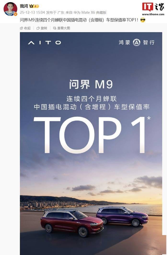 在高端汽車市場的激烈競爭中,鴻蒙智行旗下問界品牌持續展現出強勁實力。據汽車行業博主最新分享,問界M9車型已連續四個月穩居中國插電混動(含增程)車型保值率榜首,這一成績印證了市場對問界產品價值的廣泛認可。