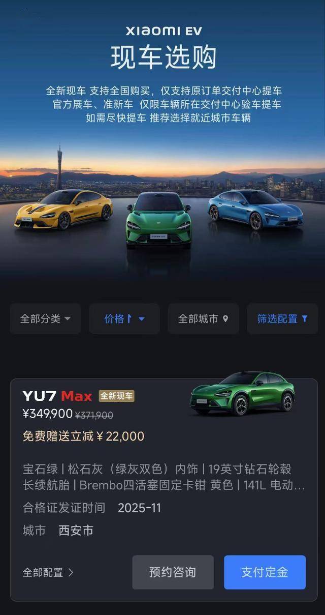 從APP展示信息來看,首批參與現車選購的車型集中在YU7和SU7的頂配版本,售價普遍超過30萬元。這些車型不僅配置高端,更通過限時優惠活動降低了購車門檻。市場分析認為,此舉有助于小米汽車在高端市場進一步擴大份額,同時提升用戶購車體驗。