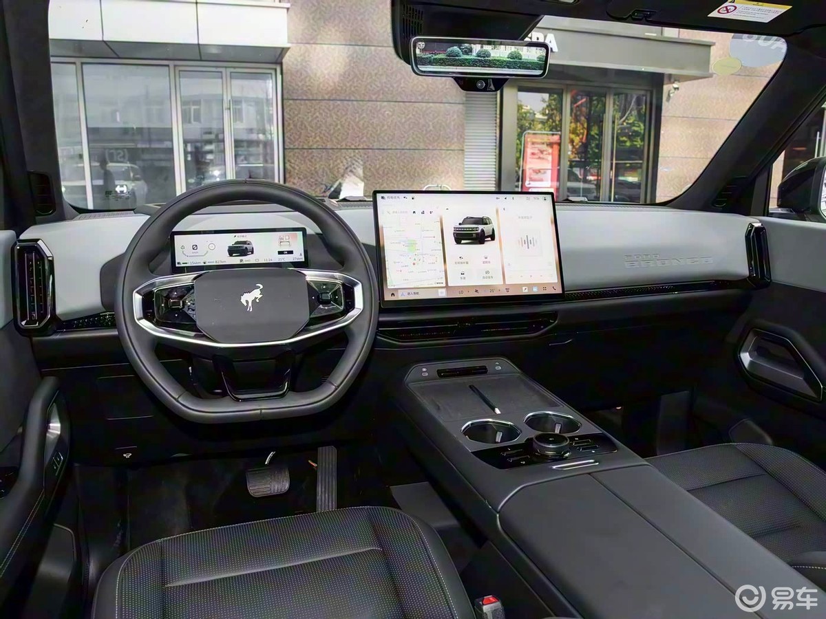 在外觀設計上,智趣烈馬延續了福特家族的經典元素,同時融入了更多城市化與年輕化的設計理念。車身以“方盒子”為基礎,通過細節調整,呈現出更加時尚、動感的姿態。獨特的日行燈組與BRONCO發光字幕相得益彰,營造出強烈的科技氛圍。車身側面線條簡潔流暢,隱藏式門把手與豎向尾燈的設計,既保留了燃油版烈馬的野性魅力,又增添了幾分都市氣息。外掛式備胎的加入,更是為整車增添了一抹不羈的風采。車身尺寸方面,增程版與純電版在高度上略有差異,但軸距均達到了2950mm,確保了寬敞的內部空間。