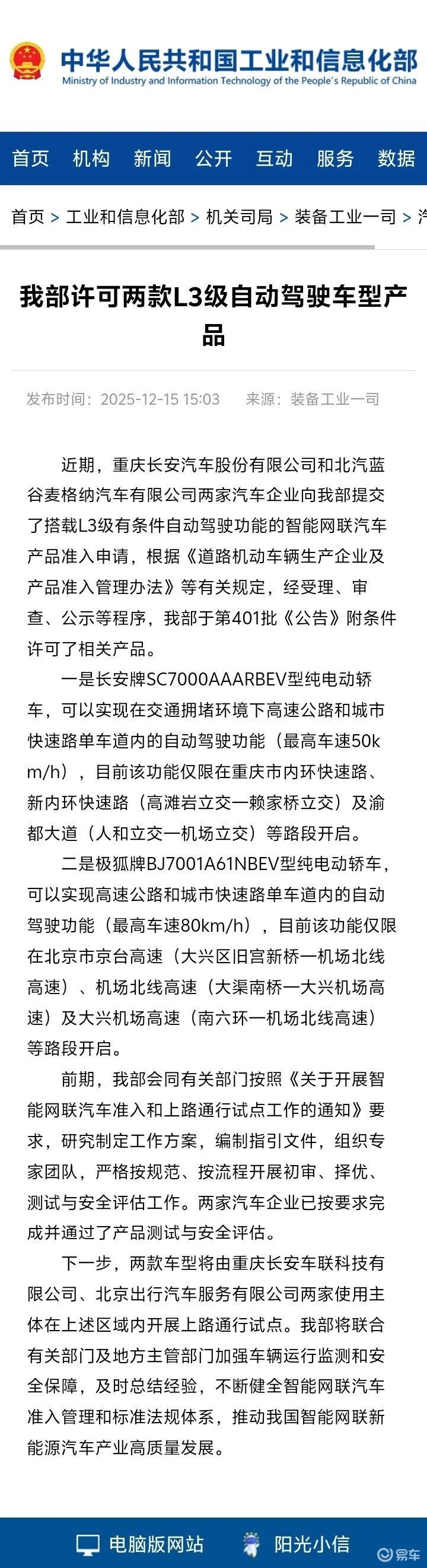 工信部近日正式頒發(fā)我國首批L3級有條件自動駕駛車型準入許可,長安深藍SL03與極狐S6成為首批通過認證的車型。這一突破性進展標志著中國自動駕駛技術(shù)從實驗室測試和輔助功能階段,正式邁入國家認可的有條件商業(yè)化應(yīng)用新階段。