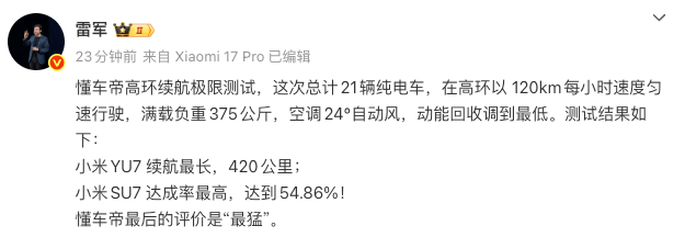 在懂車帝最新公布的純電動車“極限續(xù)航測試”榜單中,小米汽車憑借兩款車型的卓越表現(xiàn)成為焦點。其中,小米SU7以54.86%的續(xù)航達成率在20萬元級細分市場拔得頭籌,而小米YU7則以420公里的實測總里程刷新同組別續(xù)航紀錄,展現(xiàn)出強勁的技術實力。