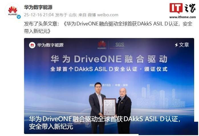 據華為官方介紹,此次認證范圍廣泛,涵蓋了控制器、執行器等關鍵部件,并覆蓋了基礎制動、防抱死系統、防滑系統、電子穩定性控制以及再生制動等融合系統控制特性。獲得這一認證的華為DriveONE融合驅動產品,是華為自主研發的首款成果,其安全性能得到了國際權威機構的認可。