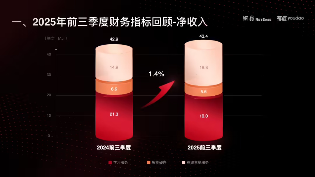 根據網易有道 CEO 周楓披露的財務數據,公司在今年前三季度實現了穩健增長。累計凈收入達到 43.4 億元,同比增長 1.4%。與此同時,運營效率顯著提升,銷售費用和管理費用等運營成本同比下降,推動經營利潤增長至 1.6 億元,同比增幅高達 149.2%。這一成績反映出公司在優化成本結構和提升盈利能力方面取得了實質性進展。