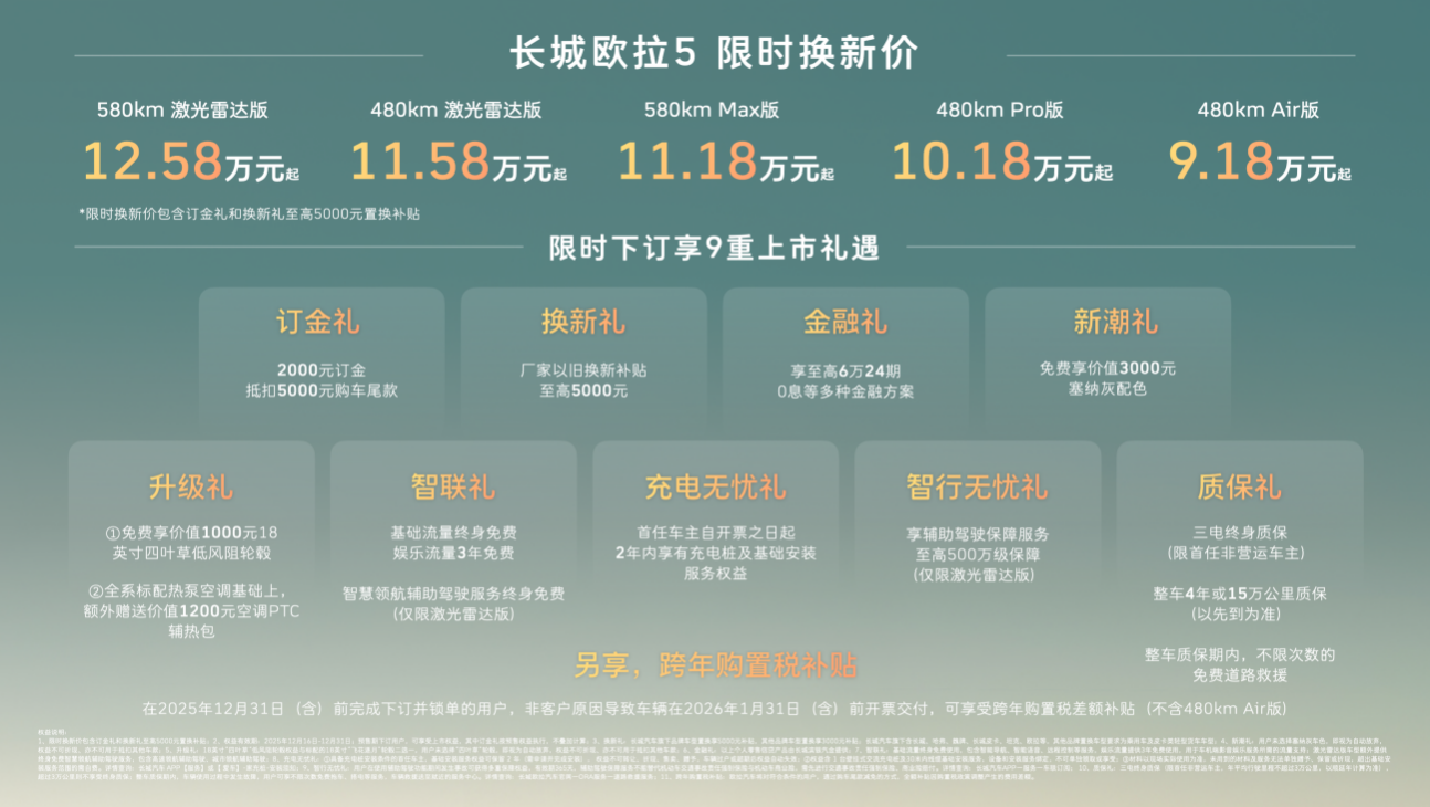 長城汽車旗下歐拉品牌近日正式推出全新緊湊型SUV——歐拉5,共帶來5款不同配置車型,官方指導價區間為9.98萬至13.38萬元,限時優惠后價格下探至9.18萬至12.58萬元。這款新車以智能化配置和多樣化動力選擇為核心賣點,在競爭激烈的純電市場中展現出獨特競爭力。