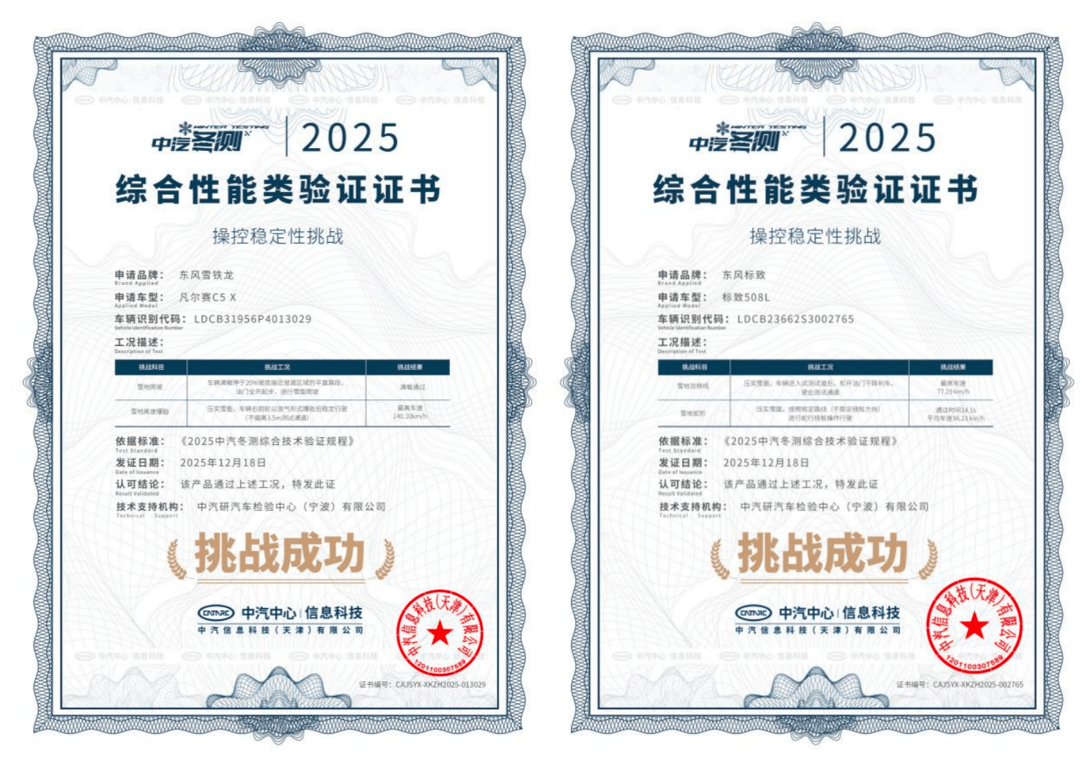 在中國汽車技術研究中心主辦的“2025極寒駕控安全主題技術驗證”活動中,東風雪鐵龍凡爾賽C5 X與東風標致508L憑借出色表現,順利通過多項嚴苛測試,展現了法系車在極端環境下的卓越性能與安全實力。