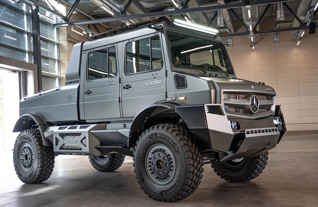 奔馳烏尼莫克U4030為紀念品牌80周年打造,基于U4023平臺強化越野性能。啞光灰車漆搭配車頂探照燈與電子后視鏡,貨廂式四座布局凸顯功能性。動力搭載300馬力7.7T六缸柴油發動機,匹配全時四驅系統與三把差速鎖,可應對極端路況挑戰。