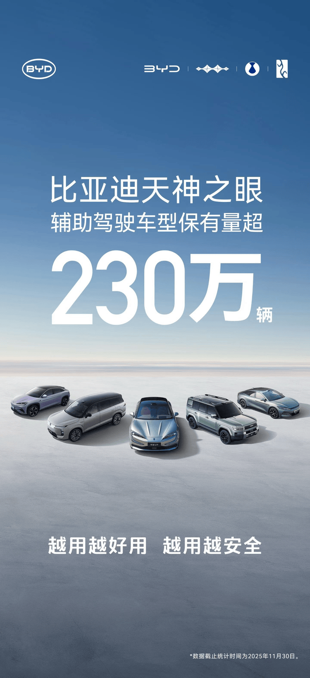 比亞迪“天神之眼”11月月銷31萬+,累計超230萬引領輔助駕駛普及潮