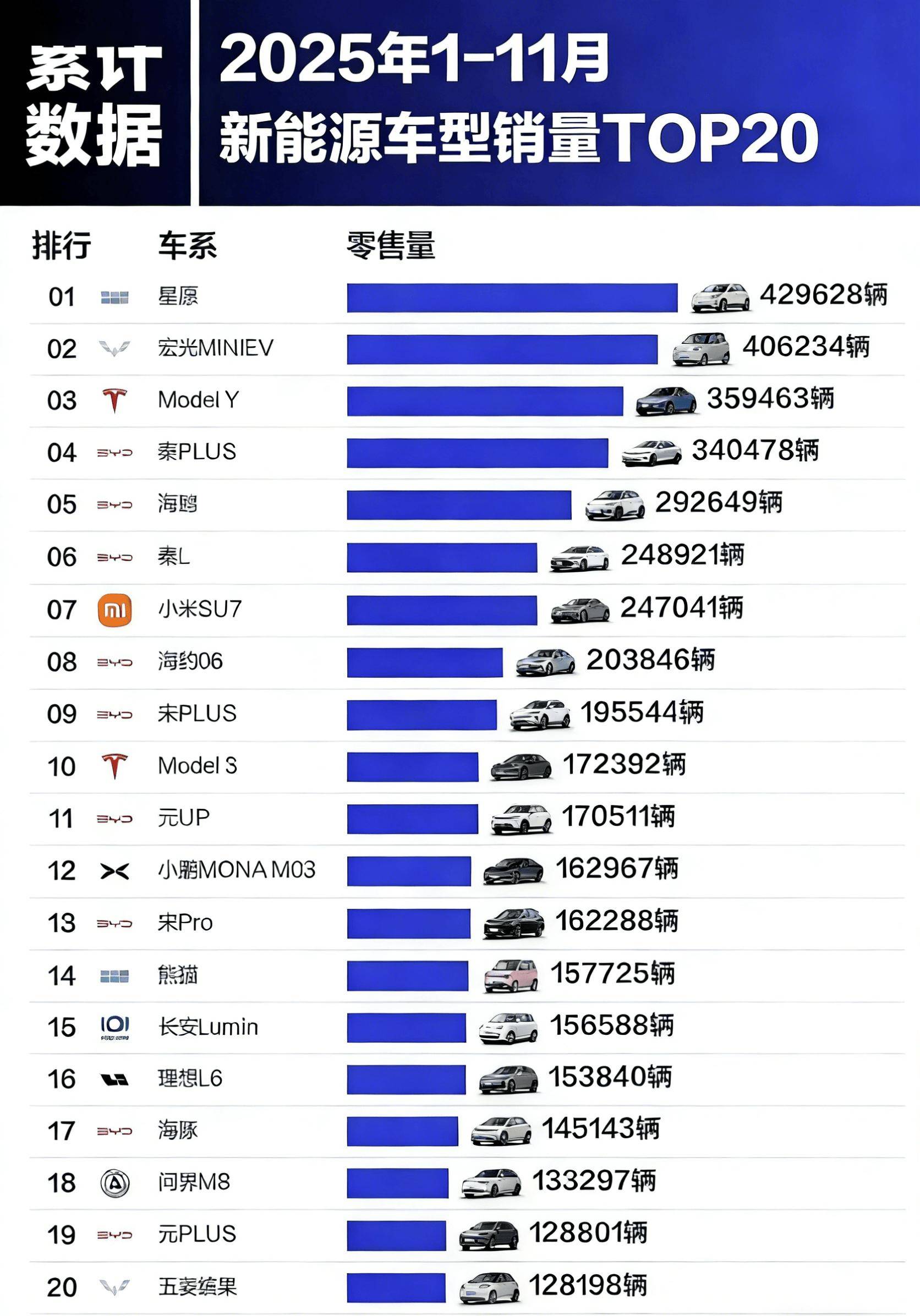 乘聯分會最新公布的零售數據顯示,2025年1月至11月新能源汽車市場格局已基本明朗,銷量前二十榜單中自主品牌占據絕對優勢,吉利星愿與特斯拉Model Y分別成為不同細分領域的標桿車型。
