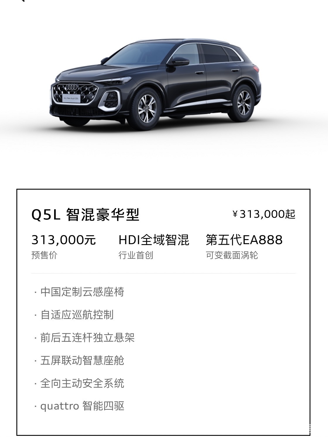 作為一款智能豪華SUV,全新奧迪Q5L在智能駕駛輔助系統(tǒng)方面也表現出色。它支持匹配華為乾崑技術及雙激光雷達,可實現無圖L2級駕駛輔助能力,為駕駛者提供更加便捷、安全的駕駛體驗。動力系統(tǒng)方面,新車提供了兩種動力選項,均為第五代EA888 2.0T渦輪增壓發(fā)動機,最大功率分別為150千瓦和200千瓦,傳動系統(tǒng)匹配7速雙離合變速箱,并采用前后五連桿獨立懸架及quattro四驅系統(tǒng),確保了出色的操控性能和行駛穩(wěn)定性。