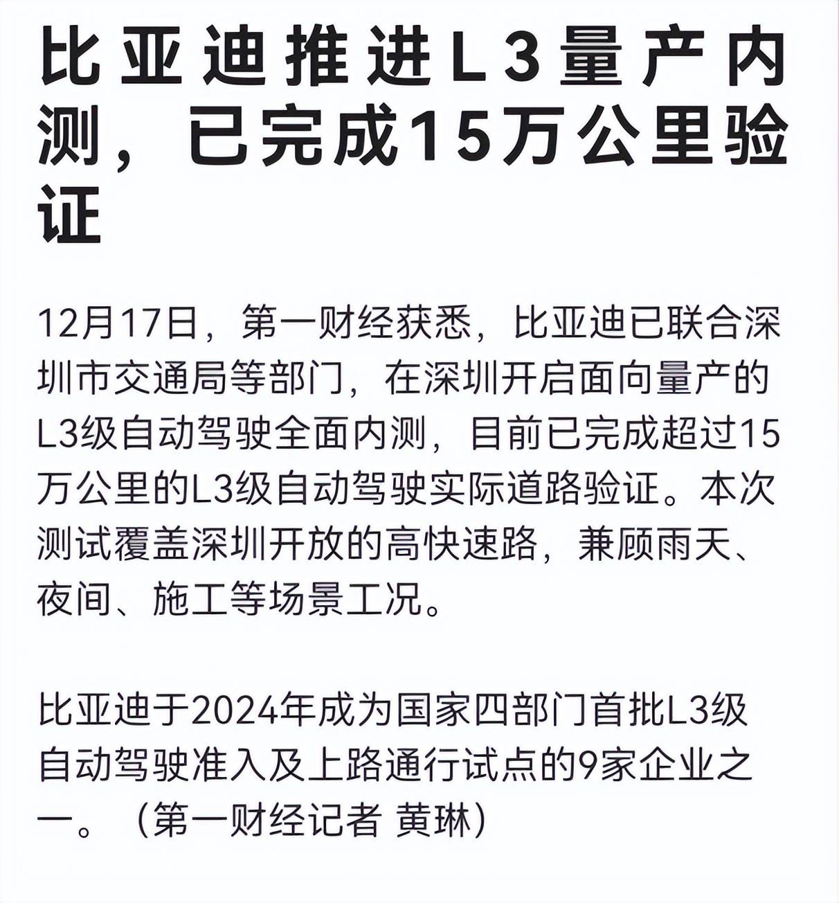 比亞迪深圳開啟L3級(jí)自動(dòng)駕駛量產(chǎn)內(nèi)測(cè) 15萬公里驗(yàn)證夯實(shí)領(lǐng)先地位