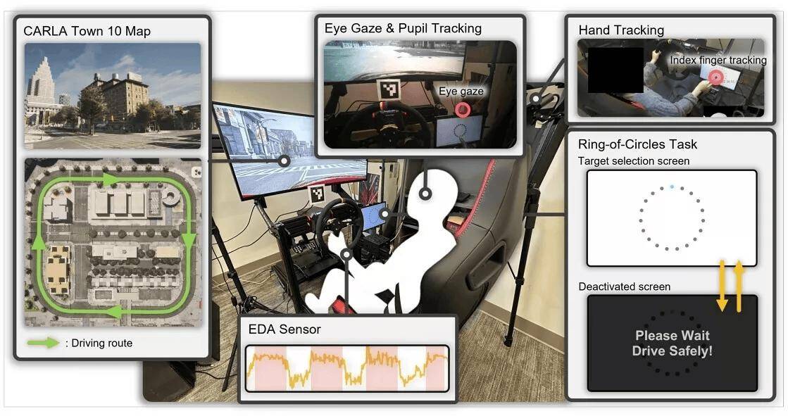 該研究名為《行駛中的觸屏:量化認知負荷對分心駕駛的影響》,于2025年9月發表在第38屆ACM用戶界面軟件與技術年度研討會論文集中。研究人員招募了16名受試者,讓他們在高仿真駕駛模擬器中完成測試。測試過程中,研究人員通過追蹤眼球運動、手部動作、瞳孔擴張程度和皮膚電導率等指標,綜合評估受試者的認知負荷水平。