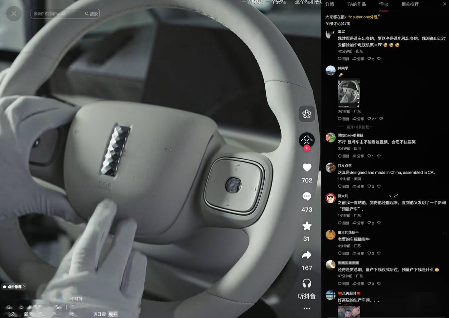 在官方發(fā)布的視頻中,F(xiàn)X Super One的部分設(shè)計(jì)細(xì)節(jié)得以提前曝光。新車輪轂采用純白色調(diào),中心位置鑲嵌FX品牌標(biāo)識,整體風(fēng)格簡潔而富有辨識度。車內(nèi)方向盤同樣融入了品牌元素,但與輪轂不同,方向盤上的車標(biāo)被印制在一塊亮面裝飾條上,這種設(shè)計(jì)既提升了視覺層次感,又避免了直接印制可能帶來的廉價(jià)感。