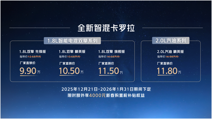 在競爭激烈的家用轎車市場,一款備受矚目的車型——全新智混卡羅拉正式登場,以煥新之姿為消費者帶來品質出行新選擇。此次全新智混卡羅拉共推出4個版本,廠商直銷價鎖定在9.9萬元 - 11.8萬元區間。即日起至1月31日下定,消費者還能限時額外享受4000元新春購置稅補貼權益,這一誠意滿滿的舉措,無疑為購車計劃增添了更多吸引力。