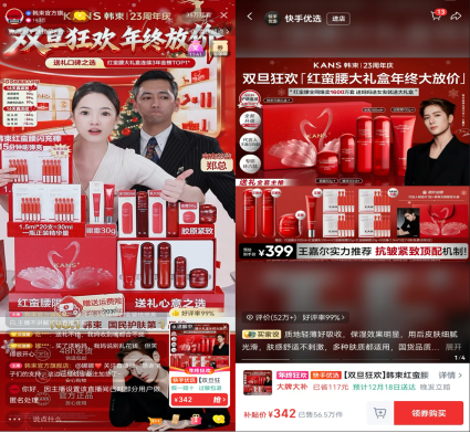 快手年終購物狂歡節期間,韓束也加碼投入內容場及貨架場經營,通過精細組建各場域貨盤等方式,打通流量流轉鏈路,從而最大化贏取商品卡川流計劃的扶持激勵,推動大促銷售提升。例如,韓束在大促期間合作優質達人展開帶貨種草,搶占用戶心智,同時結合元旦等節日熱點,對品牌自播內容進行升級,提升內容場熱度。