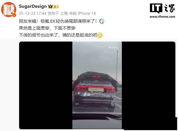 近日,有網(wǎng)友向汽車領域博主@SugarDesign投稿,曝光了極氪8X輕偽裝狀態(tài)下的尾部諜照。從諜照中可以看到,極氪8X的尾燈設計獨具特色,采用了上貫穿、下不貫穿的造型。