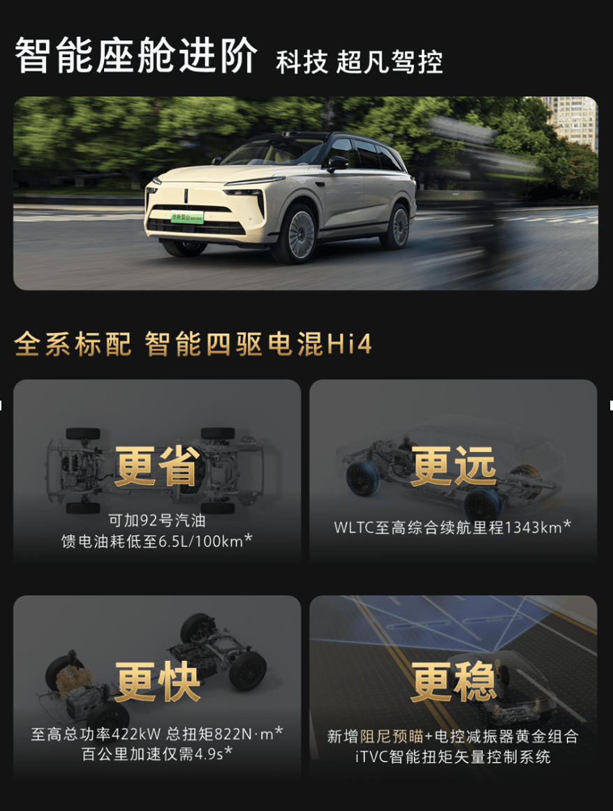 動力系統展現技術突破。Hi4性能版智能四驅電混技術采用四擋全速域直驅結構,實現前后軸50:50軸荷分配,配合iTVC智能扭矩控制系統,在提升行駛穩定性的同時優化能耗表現。官方數據顯示,新車0—100km/h加速僅需4.9秒,饋電油耗低至6.5L/100km,綜合續航里程達1343公里。底盤升級的阻尼預瞄功能可提前識別減速帶等路況,自動調整懸架狀態,為家庭出行提供更舒適的駕乘體驗。