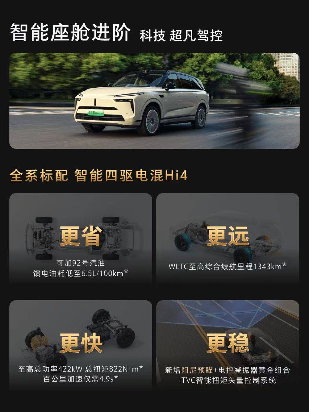 動力系統方面,全新藍山智能進階版全系標配Hi4性能版智能四驅電混技術。該系統由1.5T渦輪增壓發動機與前后雙電機組成,系統綜合功率達392千瓦,零百加速僅需4.9秒,性能表現媲美純電車型。續航能力上,車輛提供兩種電池容量選擇,WLTC工況下純電續航分別為185公里與220公里,綜合續航最高可達1343公里,有效緩解用戶的里程焦慮。這一數據在同級插混SUV中處于領先水平,尤其適合長途出行場景。
