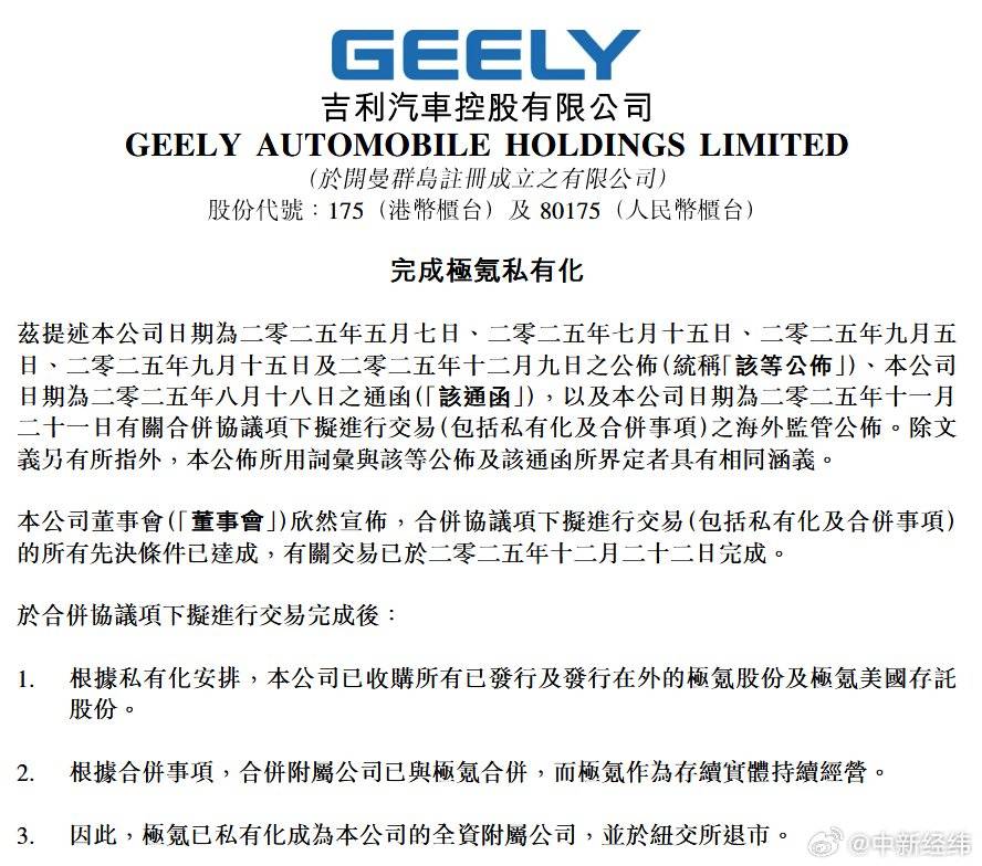 吉利汽車近日在港交所發布重要公告,宣布其此前披露的合并協議項下交易已順利完成。根據公告內容,此次交易涉及私有化及合并事項,所有預設的先決條件均已達成,并于2025年12月22日正式落地實施。