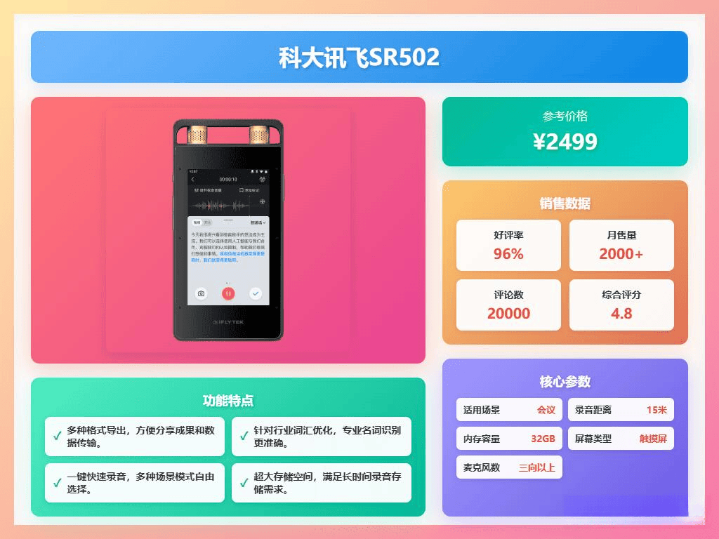 市場反饋顯示,科大訊飛智能錄音筆正在重塑專業錄音設備標準。其將AI語音技術、硬件設計與用戶需求深度融合的研發思路,為行業樹立了新的標桿。隨著遠程辦公與跨語言協作需求的增長,這類具備高精度錄音與智能轉寫功能的設備,正成為現代職場人士的標配工具。