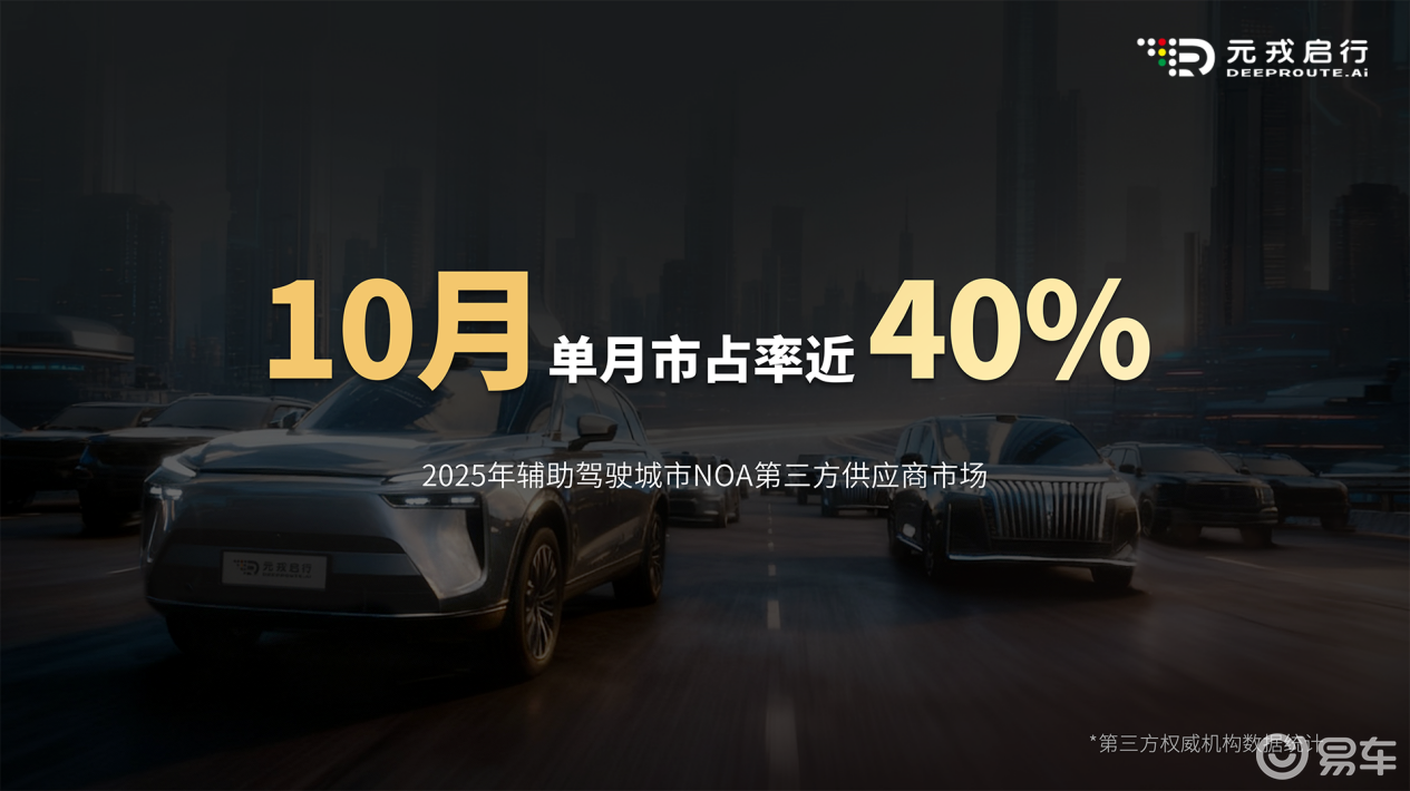 支撐VLA模型量產(chǎn)的,是元戎啟行成熟的工程化體系。數(shù)據(jù)顯示,該公司已向市場交付20萬輛搭載城市NOA(領(lǐng)航輔助駕駛)的量產(chǎn)車型,合作范圍覆蓋SUV、MPV、越野車等主流品類。2025年10月權(quán)威機(jī)構(gòu)統(tǒng)計(jì)顯示,其在輔助駕駛城市NOA第三方供應(yīng)商市場的單月市占率已接近40%,穩(wěn)居行業(yè)前列。