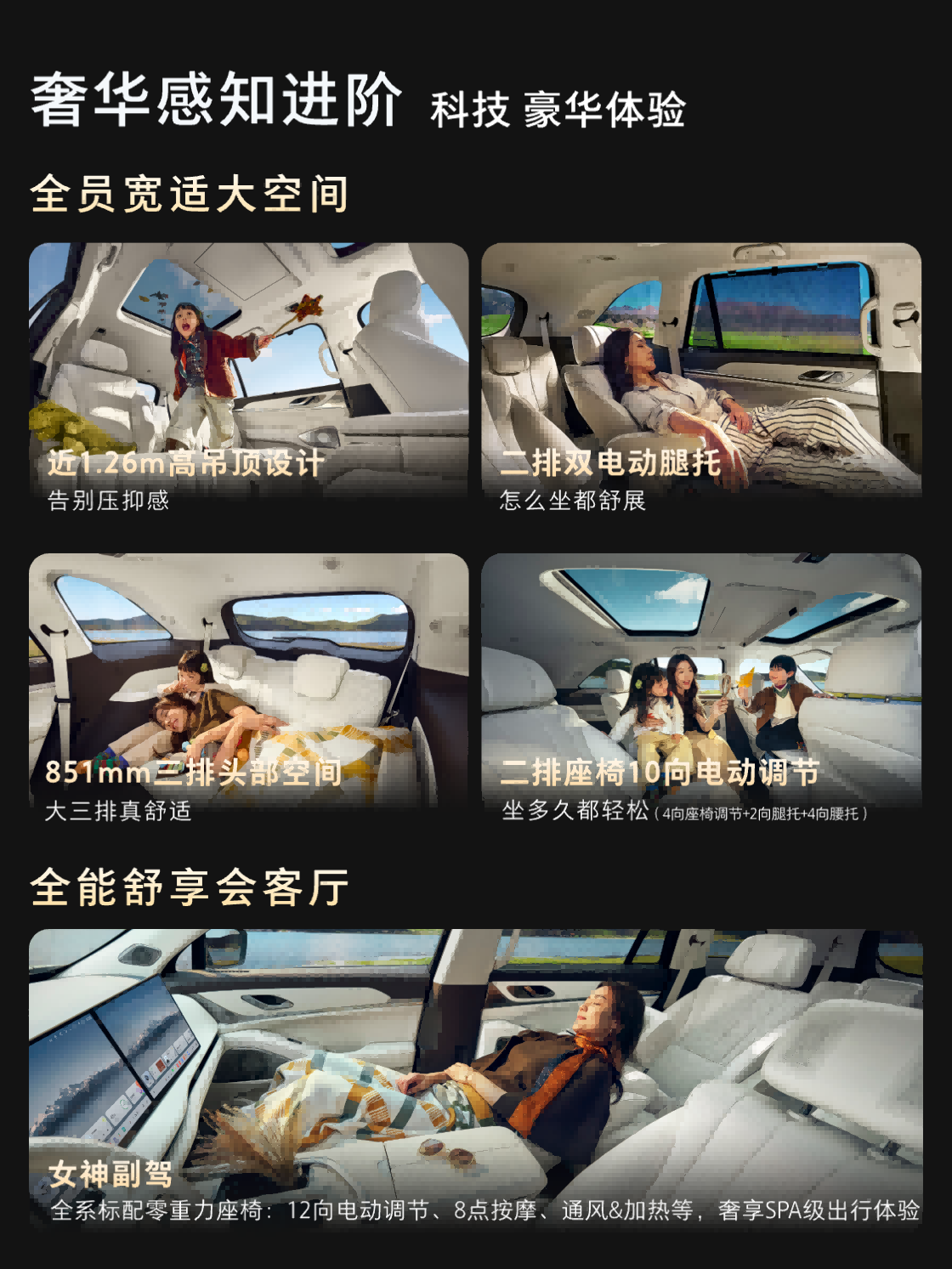 在座艙設計上,新車堅持“車內無主次”理念,每個座位都承載對家人的關懷。主駕配備八點按摩功能,副駕支持一鍵零重力模式,二排座椅帶腿托并可一鍵拓展空間,第三排確保成人可坐可躺。7L豪華冰箱支持-6℃至50℃溫度調節,滿足全家需求。Coffee OS 3.4系統打造“五好座艙”,23揚聲器支持7.1.4全景聲,后排17.3英寸3K娛樂屏配合AI多屏擴畫和暈動舒緩顯示功能,緩解行車中的暈車不適感。“小魏同學”還能主動感知環境并提供協同服務。