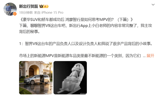 新出行賀磊揭秘智界V9:封閉式“御風型面”設計,座椅與空間亮點多