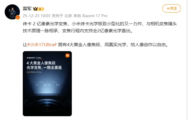 小米科技創始人雷軍在社交平臺發布重磅消息,即將面世的小米17 Ultra將全球首發搭載徠卡聯合研發的2億像素光學變焦鏡頭。這項突破性技術被定義為"移動影像光學小型化的里程碑式創新",其核心架構直接繼承自專業相機光學系統。