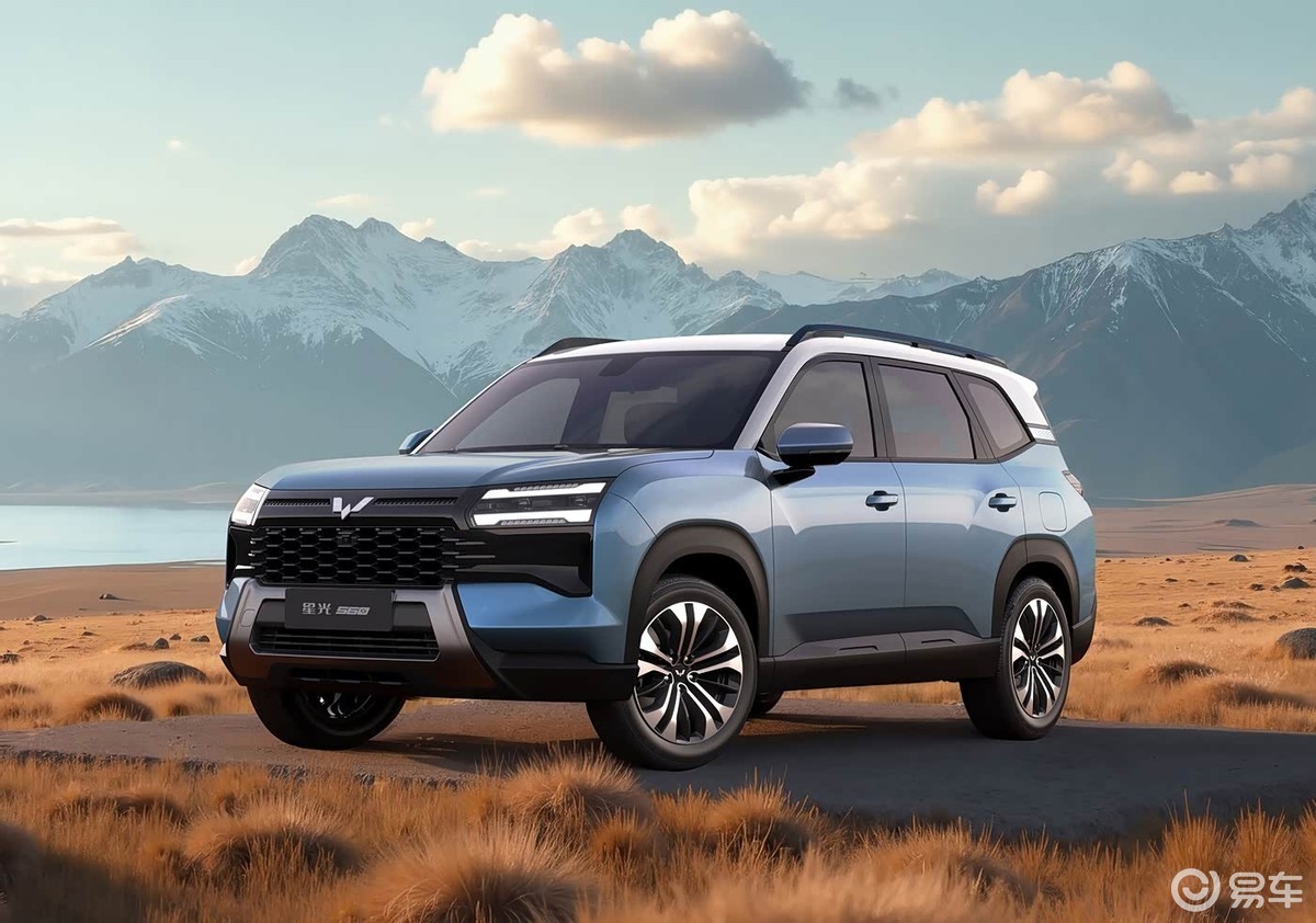 在外觀設計上,星光560展現出獨特的風格。前臉采用無邊界式前格柵,與兩側燈組無縫銜接,中央鑲嵌銀色五菱徽標。燃油版車型的進氣格柵內部為蜂窩狀結構,前保險杠下方配有槍灰色防擦護板;新能源版本則采用寬大的橫條設計,彰顯其電動身份。車身側面線條流暢,懸浮式車頂搭配前后輪眉和亮黑色行李架,營造出動感的視覺效果。車尾設計簡潔大方,配備擾流板和槍灰色護板,進一步強化運動氣息。