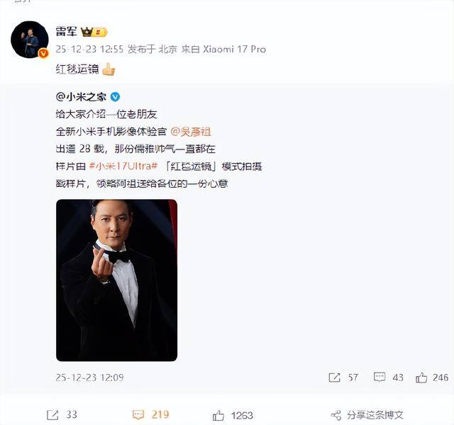 吳彥祖出任小米手機影像體驗官 雷軍點贊#小米17Ultra#“紅毯運鏡”新模式