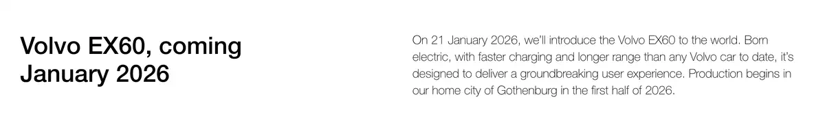 沃爾沃品牌即將在純電SUV領域再添新成員——沃爾沃EX60。這款基于SPA3純電平臺打造的全新車型,預計將于2026年1月21日正式亮相,其WLTP工況下的純電續航里程有望突破700公里,成為品牌在新能源市場的重要布局。