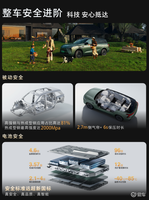 在安全防護方面,全新藍山智能進階版構建了全維安全守護體系。車輛車身81%采用高強鋼與熱成型鋼,關鍵部位熱成型鋼強度達2000兆帕。電池安全方面,模擬碰撞測試加速度是國標的2倍,鹽霧腐蝕測試時長將近國標的5倍,熱擴散觀察時長是國標的12倍,浸水時長是國標的96倍。除了堅固的“硬身板”,車輛還具備主動防護能力。超過30項智能輔助功能與AEB自動緊急制動功能已上車,明年第二季度還將推送AES自動緊急避讓系統和RAEB,進一步降低碰撞風險。同時,車內采用CIAA認證抗菌皮革、生態膚感NAPPA真皮,VOC嬰兒級空氣質量控制,保障家庭用戶呼吸健康。