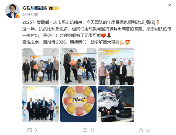比亞迪旗下硬派越野品牌方程豹近日宣布,已成功完成2025年度既定銷量目標。品牌總經(jīng)理熊甜波在社交平臺發(fā)文稱:“完成年度最后一次市場調(diào)研后,團隊順利達成全年目標。盡管面臨諸多挑戰(zhàn),但憑借對產(chǎn)品的熱愛與執(zhí)著,我們交出了一份令人滿意的答卷。”不過,她并未透露具體銷量數(shù)字。