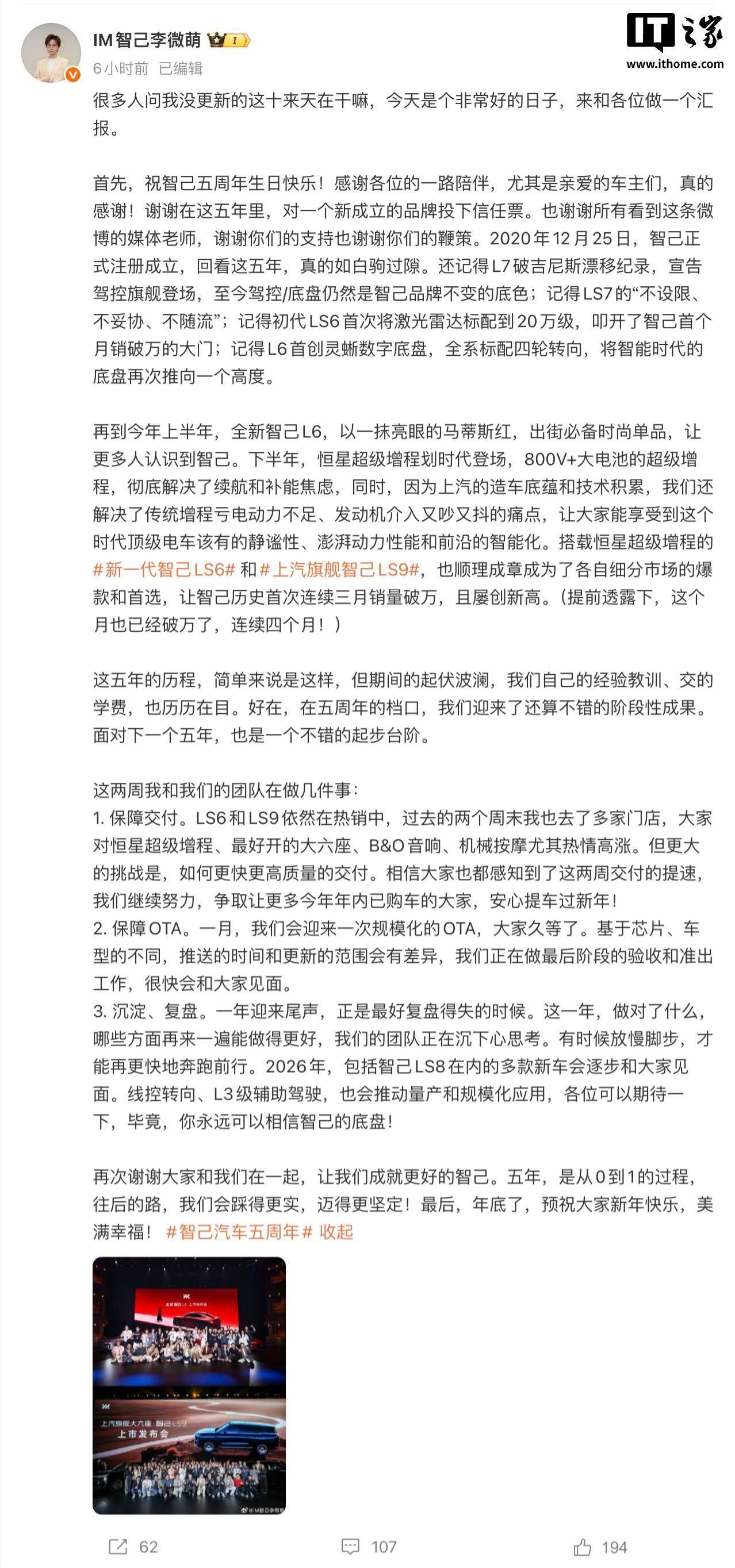 針對(duì)當(dāng)前用戶關(guān)切,李微萌同步披露了交付與服務(wù)進(jìn)展。品牌正全力保障智己LS6與LS9的年底交付工作,確保年內(nèi)訂車用戶能在春節(jié)前提車。同時(shí)宣布將于2025年1月啟動(dòng)大規(guī)模OTA升級(jí),具體推送時(shí)間與更新內(nèi)容將根據(jù)車型及芯片配置差異化部署。此次升級(jí)預(yù)計(jì)將優(yōu)化智能座艙交互體驗(yàn)與輔助駕駛功能,強(qiáng)化產(chǎn)品競(jìng)爭(zhēng)力。